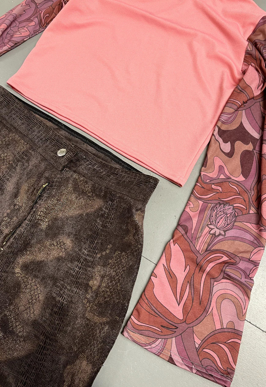 Be super stylish in our pink floral print flare cropped top! Crafted with stretchy dead stock fabric, it's as comfy as it is chic. Rock that trendy look with panels of pink crepe fabric, paired with a soft floral print and long flared sleeves. Wear it for a timeless look that never goes out of style!